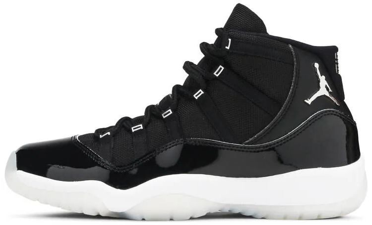 The grade school variant of the Air 11 閳ユクubilee閳?. also known as the Air 11 '25th Anniversary' . celebrates the classic silhouette閳ユ獨 quarter-century birthday with a monochrome black finish throughout the upper . constructed from a traditional blend of ballistic mesh and patent leather. In keeping with the shoe閳ユ獨 silver anniversary . a 3D metallic Jumpman and matching 閳?3閳?branding decorate the heel . while 閳ユǚ鈧?is spelled out in stylized silver lettering on each of the sneaker閳ユ獨 eyelets. The mid-top rides on a classic white foam midsole . supported by a translucent rubber outsole.