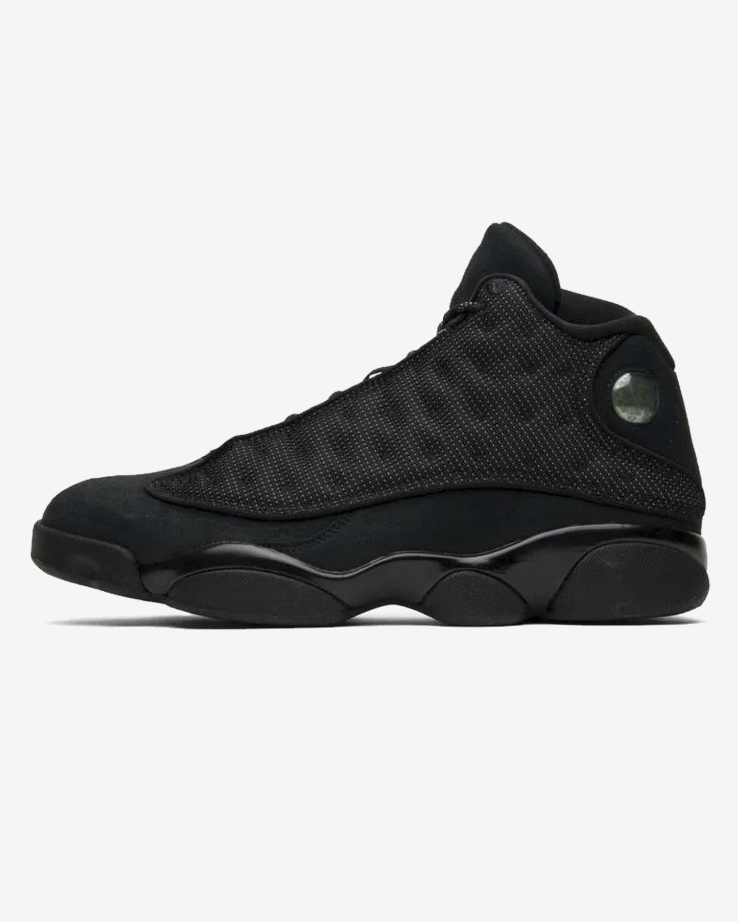 The Air 13 Retro ユイlack Cat showcases a monochromatic finish that plays off one of Michael many nicknames. The black suede upper is accented with a holographic cat eye and reflective detailing on the sneaker mesh overlays and rope laces. A glossy finish is applied to the matching black Phylon midsole . which houses Air units in the heel and forefoot. The 1 signature panther paw outsole features herringbone traction for imum grip.