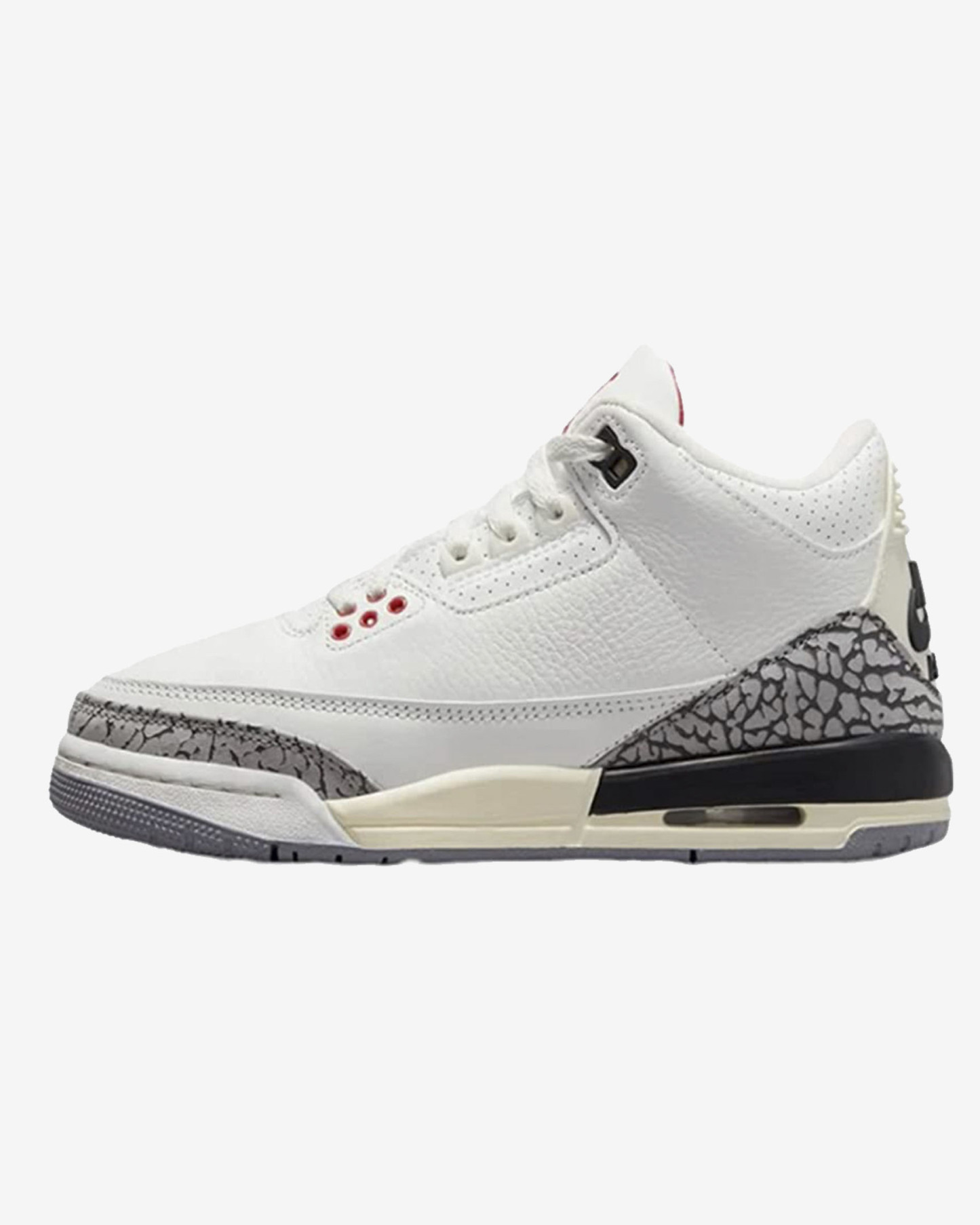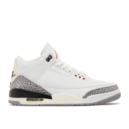 Commemorating 35 years of a classic silhouette, the Air 3 Retro 'White Cement Reimagined' marks the return of an original colorway and duplicating the build of the original 1988 model. The upper combines white leather with overlays on the heel and toe in the trademark elephant print that designer Tinker Hatfield introduced, with Varsity Red pops on the tongue’s Jumpman branding and the lace loops. Additional branding appears on the heel tab with Air.Comfort underfoot is ensured by a visible Air-sole unit and the back heel and midsole are imbued with an aged yellow tint to showcase a vintage look.