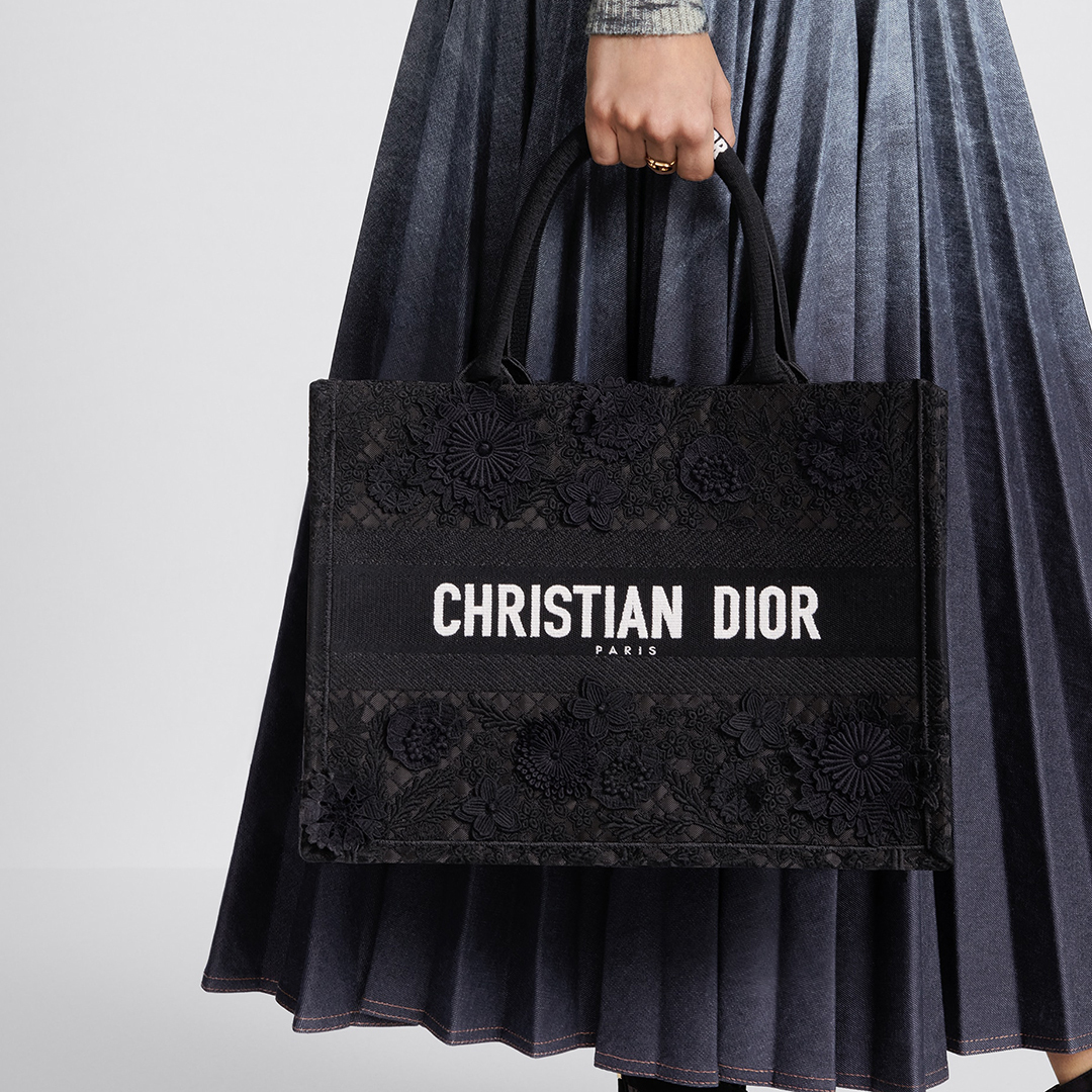 Introduced by Maria Grazia Chiuri, Creative Director of Christian , the Book Tote has become a staple of the aesthetic. Designed to hold all the daily essentials, the style is fully embroidered with a black multicolor D-Lace motif with 3D Macram?? effect, inspired by lace and displaying the House's savoir-faire through refined embroidery and three-dimensional hand-applied flowers. Enhanced by the Christian Paris signature on the front, the medium tote exemplifies the signature craftsmanship and may be carried by hand or worn over the shoulder.
