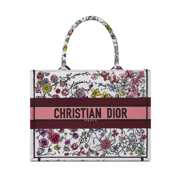 Introduced by Maria Grazia Chiuri, 's Creative Director, the Book Tote has become a staple of the aesthetic. Designed to hold all the daily essentials, the style is fully embroidered with the white multicolor Florilegio motif showcasing a bucolic, elegant and colorful universe. The design is adorned with the Christian Paris signature on the front and exemplifies the House's signature savoir-faire. The medium tote may be carried by hand or worn over the shoulder.