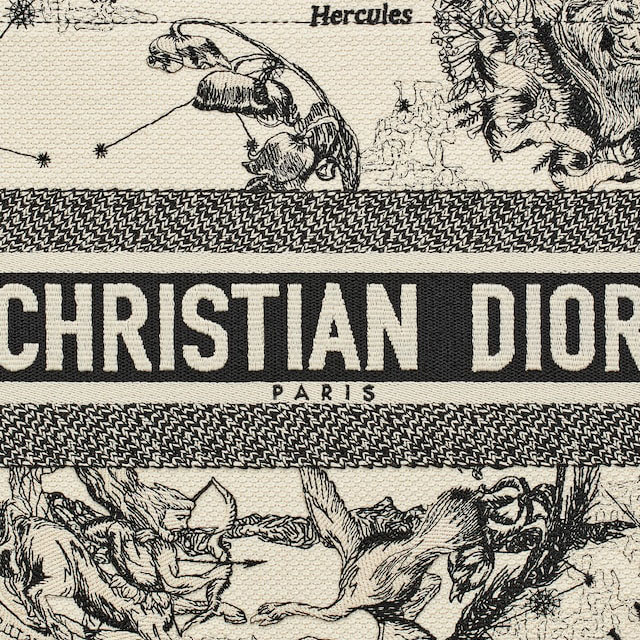 Introduced by Maria Grazia Chiuri, Creative Director of Christian , the Book Tote has become a staple of the aesthetic. Designed to hold all the daily essentials, the style is fully embroidered with the latte and black Zodiac motif created by the artist Pietro Ruffo. Adorned with the Christian Paris signature on the front, the medium tote exemplifies the House's signature savoir-faire and may be carried by hand or worn over the shoulder.