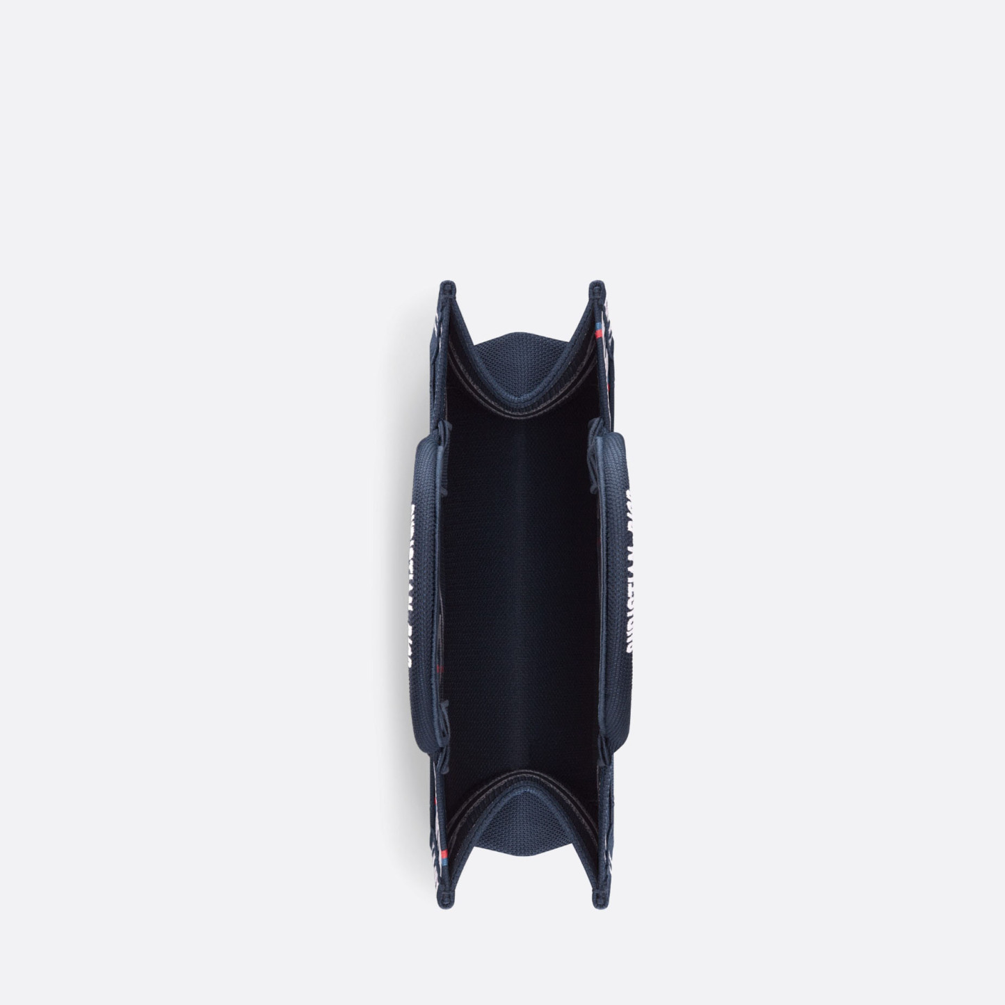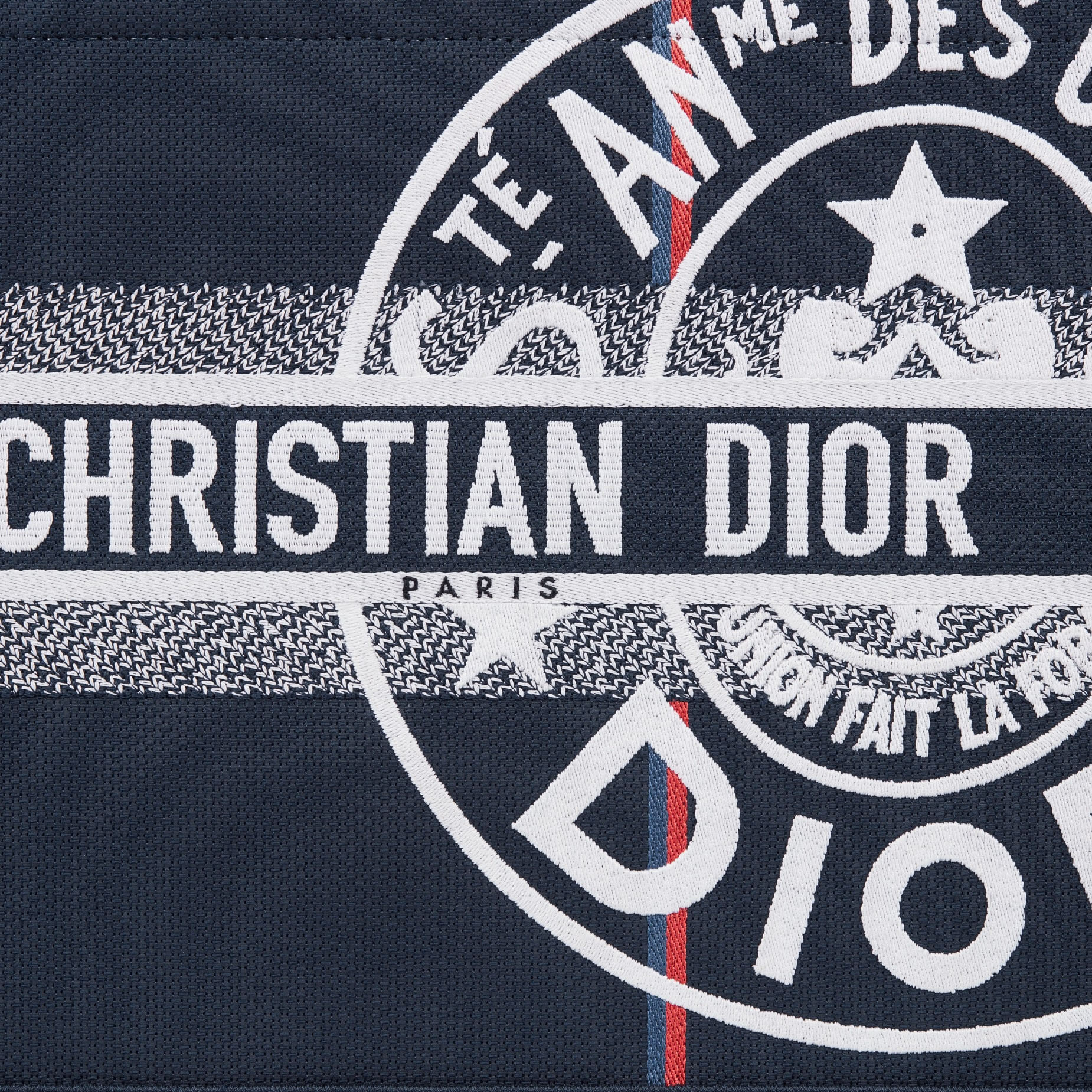 The Book Tote, an original style by Maria Grazia Chiuri, is a House classic. Designed to hold all the daily essentials, the blue bag is fully embroidered with the Union motif, showcasing the L'Union Fait la Force motto inspired by the atelier's jute bags, reaffirming the teamwork and collaborative spirit dear to the Creative Director. Enhanced by the Christian Paris signature on the front, the medium bag is a prime example of 's savoir-faire, and can be carried by hand or worn over the shoulder.