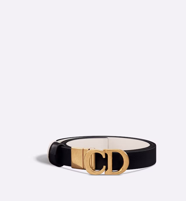The Saddle belt has become a House icon and a wardrobe classic. It is offered in a reversible variation, thanks to its swivel feature. Crafted in black smooth calfskin on one side and latte on the other, it is embellished with the antique gold-finish metal CD buckle. The design also features two removable loops that can be worn in a tonal or contrasting fashion. The timeless accessory elegantly highlights the waist and will coordinate well with jeans, a skirt or a dress.