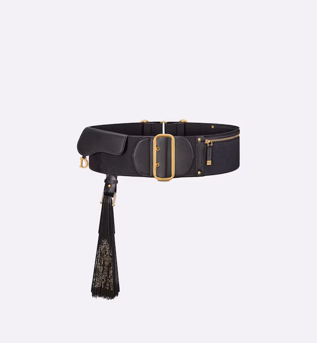 A signature piece from the fashion show, the Saddle belt revisits the eponymous line's hallmark codes with a modern and elegant spirit. Crafted in black calfskin and technical fabric, it is enhanced by a Saddle flap pocket adorned with an antique gold-finish metal 'D' stirrup on one side and a zipped patch pocket on the other. The wide belt, to which one of the season's fans can be attached, will elevate a skirt, dress or Bar Jacket.
