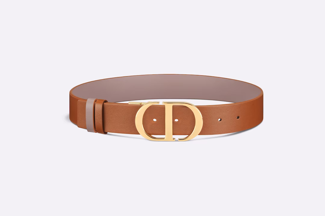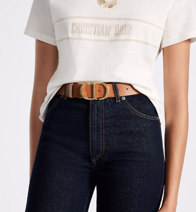 Inspired by the hallmark namesake bag, the 30 Montaigne belt is offered in a reversible variation, thanks to its swivel feature. Crafted in golden saddle smooth calfskin on one side and warm taupe on the other, it is embellished with the iconic shiny gold-finish metal CD buckle. The design also features two removable loops that can be worn in an either tonal or contrasting fashion. The timeless accessory elegantly highlights the waist and will pair effortlessly with jeans, a skirt or a dress.