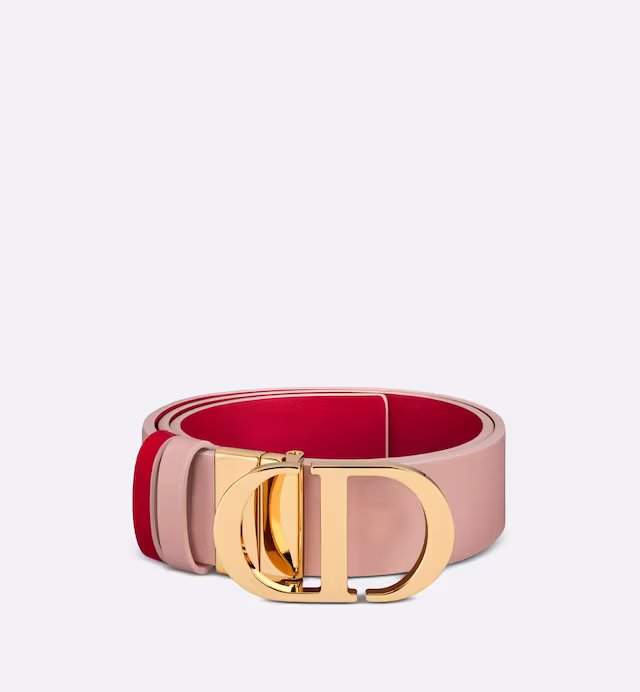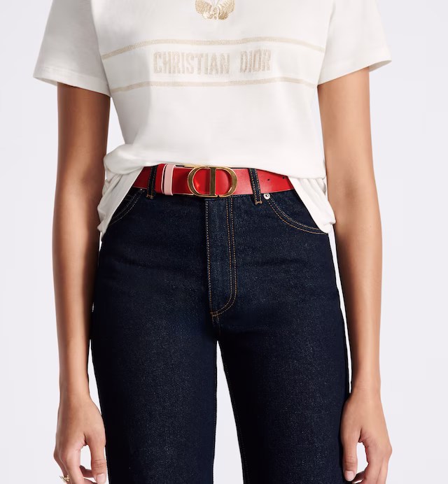 Inspired by the hallmark namesake bag, the 30 Montaigne belt is offered in a reversible variation, thanks to its swivel feature. Crafted in nude smooth calfskin on one side and amaryllis red on the other, it is embellished with the iconic shiny gold-finish metal CD buckle. The design also features two removable loops that can be worn in an either tonal or contrasting fashion. The timeless accessory elegantly highlights the waist and will pair effortlessly with jeans, a skirt or a dress.