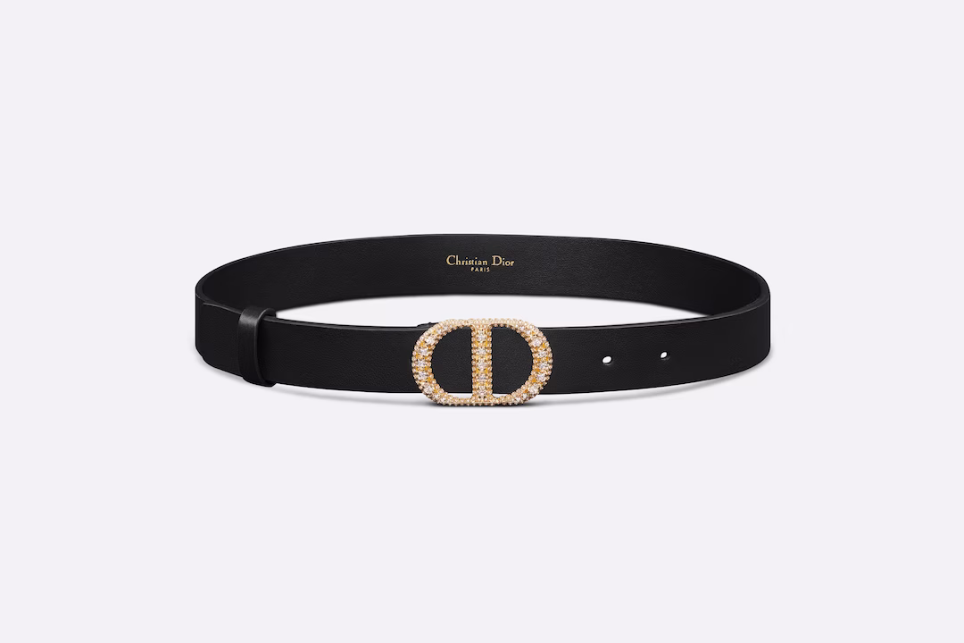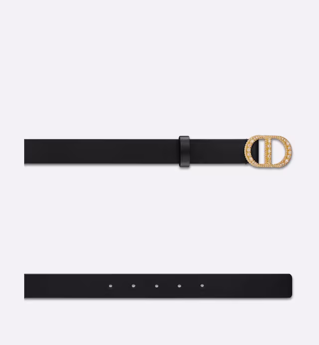 Inspired by the hallmark namesake bag, the 30 Montaigne Crystals belt is offered in a new variation that's timeless and elegant. Crafted in black smooth calfskin, it is embellished with an iconic shiny gold-finish metal 'CD' buckle revisited with silver-tone crystals. The modern accessory elegantly highlights the waist and pairs well with jeans, a skirt or dress.