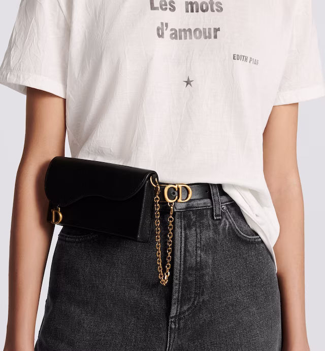 New for Winter 2023, the belt with removable pouch adds an elegant hybrid style to the Saddle line. Its thin silhouette is crafted in black ultrasoft calfskin and is enhanced by the iconic antique gold-finish metal CD buckle. A link chain reveals a removable pouch in tonal goatskin to hold cards and small essentials. The belt may be paired with jeans, a skirt or a dress.