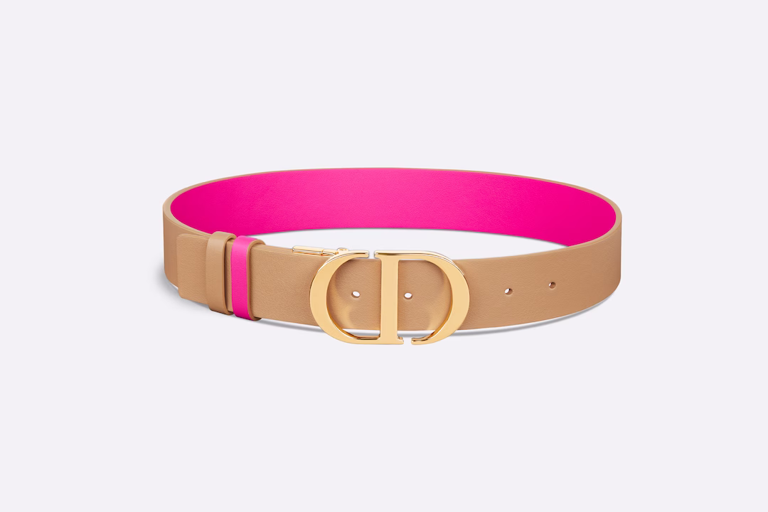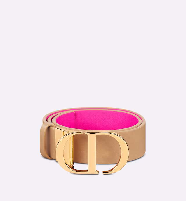 Inspired by the hallmark namesake bag, the 30 Montaigne belt is offered in a reversible variation, thanks to its swivel feature. Crafted in Rani pink smooth calfskin on one side and medium tan on the other, it is embellished with the iconic shiny gold-finish metal CD buckle. The design also features two removable loops that can be worn in an either tonal or contrasting fashion. The timeless accessory elegantly highlights the waist and will coordinate well with jeans, a skirt or a dress.
