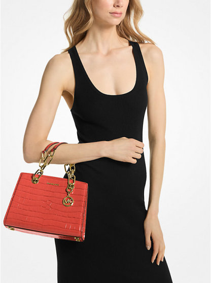 Our crocodile-embossed leather Cynthia satchel is equal parts chic and pragmatic. Chain-trimmed top handles and touches of polished hardware add to its feminine charm, while a petite, compartmented interior keeps your necessities safe and organized. Wear it crossbody on days that call for an easier attitude.