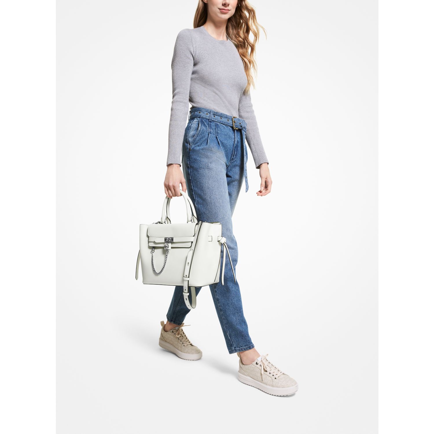 A pragmatic yet statement-making accessory, our Hamilton Legacy satchel is an instant icon. Crafted from luxe leather, it features adjustable side gussets and a polished chain-link pendant for decorative appeal. Its compartmented interior will easily hold a laptop plus a day’s worth of essentials.