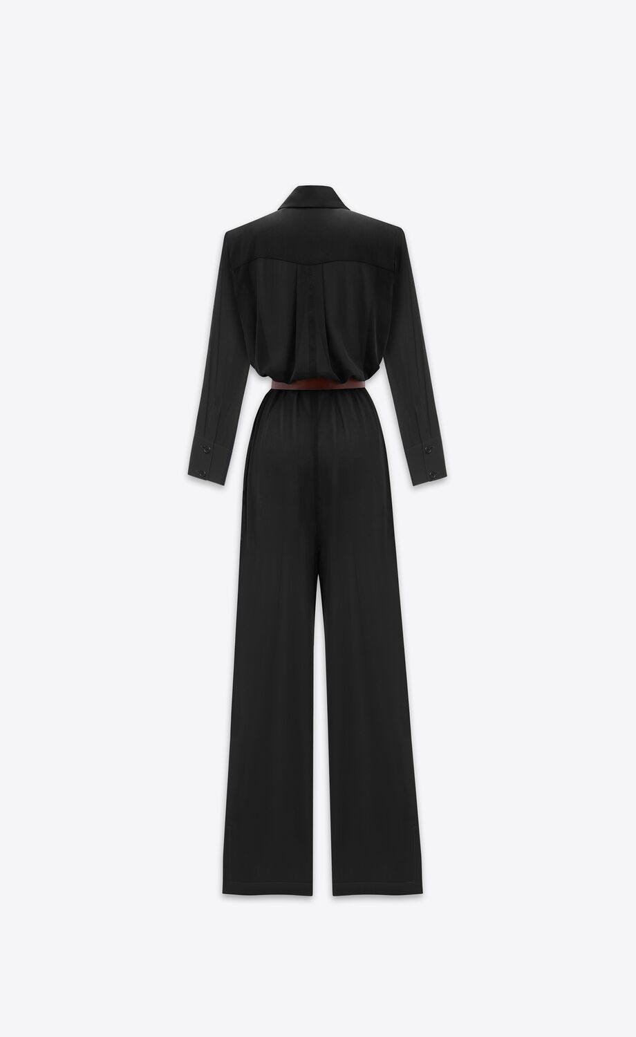 SEMI-SHEER BELTED JUMPSUIT MADE WITH ORGANIC SILK, FEATURING A LONG-SLEEVE TOP WITH PADDED SHOULDERS AND FLAP POCKETS, AND WIDE-LEG PANTS WITH A SIDE SLIT.