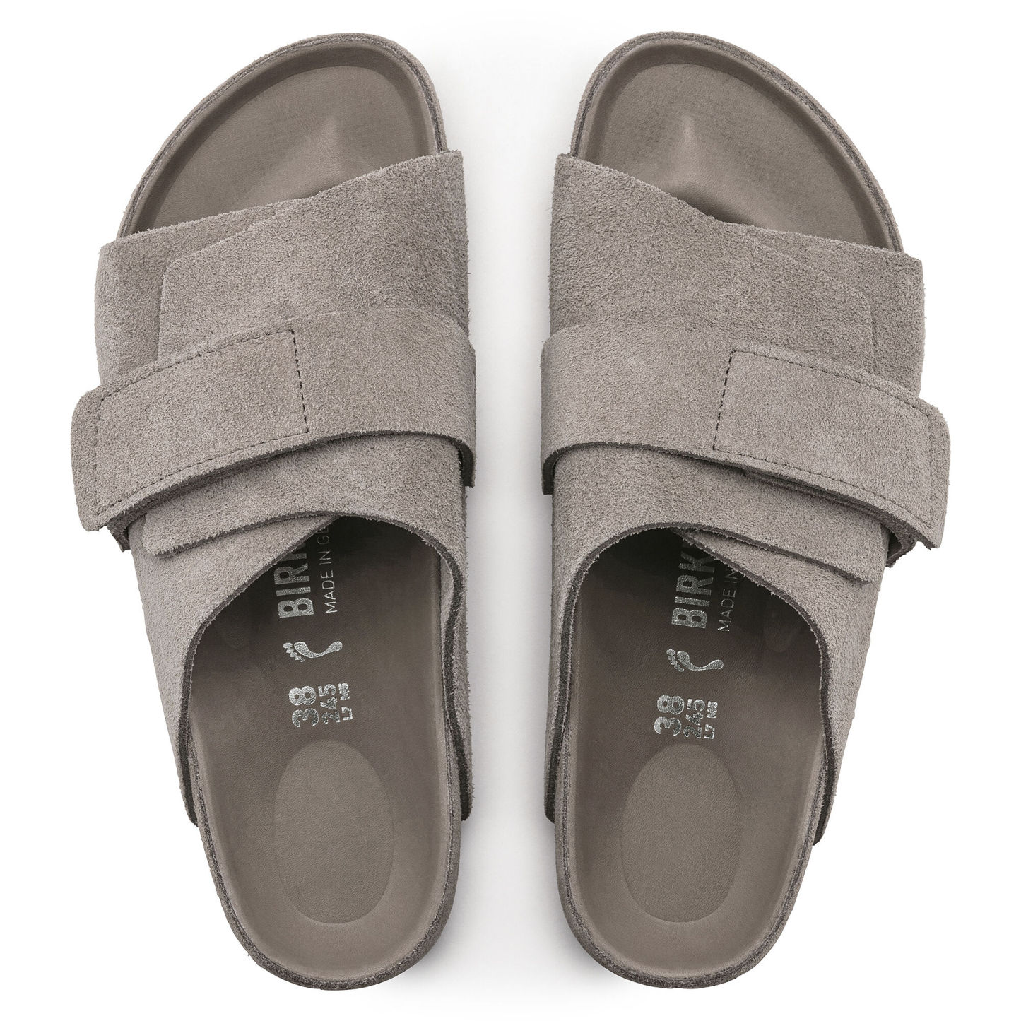 The casual BIRKENSTOCK Kyoto stands out with its envelope design and individually adjustable hook and loop closure. Giving this casually stylish sandal a slipper like fit and feel. This exquisite version features a footbed fully lined with luxuriously smooth, color coordinating leather. The upper is made from especially soft suede.