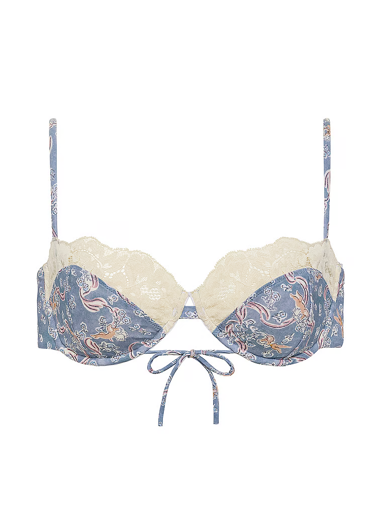 Perfect for daydreaming in the sunshine, delicate, feminine details adorn this style that features a flattering scoop neckline. A center bow and sheer lace trim add the finishing touch. From Montce.