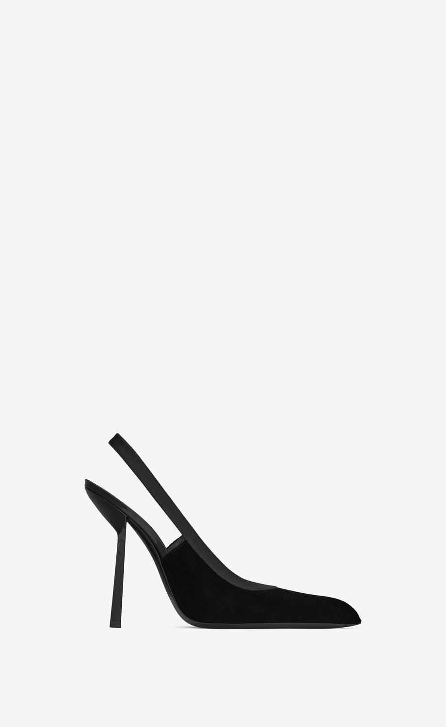 SLINGBACK PUMPS WITH A POINTED TOE AND ASYMMETRIC STILETTO HEEL, FEATURING A SATIN-TRIMMED VAMP AND ELASTICIZED SLINGBACK STRAP.