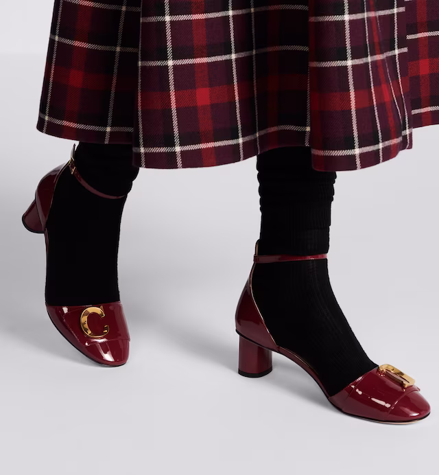 New for Winter 2023, the C'est pump is an elegant and modern creation. Crafted in deep fuchsia patent calfskin, the streamlined style is enhanced by gold-finish metal C and D letters, inspired by House archives. Completed by a rounded toe with a modern look and a 5 cm (2) cylindrical heel, the ankle-strap pump will lend a refined touch to any outfit.