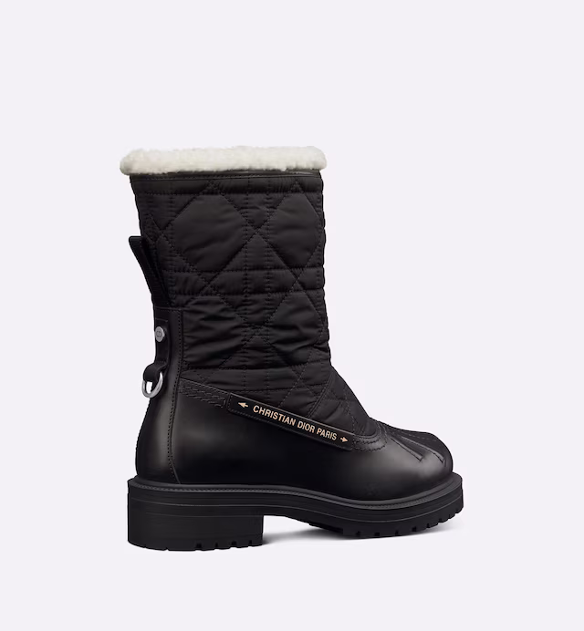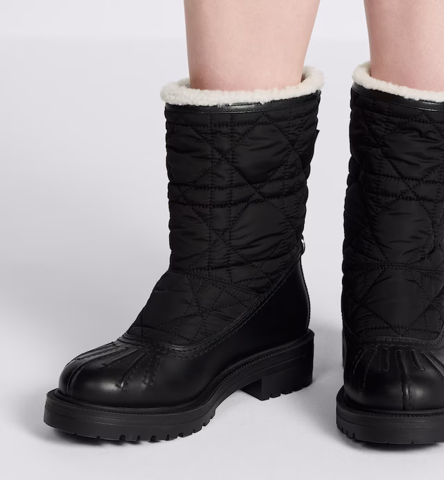 New for Winter 2023, the Frozen-D ankle boot reframes the snow boot with the House's codes of couture. Combining black calfskin and quilted nylon with the Cannage motif, it reveals a gold-tone Christian Paris signature on the side and the CD initials on the back. Featuring a thick notched sole and lined with white shearling, the ankle boot will add the finishing touch to all winter looks.