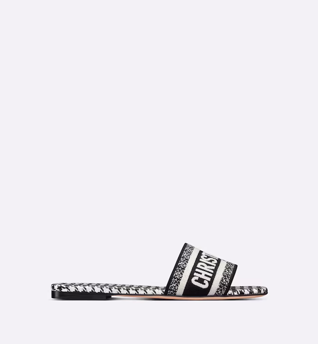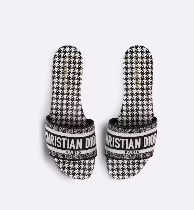 Hallmark and timeless, the Dway slide features the micro-Houndstooth motif. The black and white cotton upper has an embroidered Christian Paris signature for an instantly recognizable touch. Its streamlined silhouette makes it easy to slip on to complete a relaxed look that will pair well with other Houndstooth creations from the collection.