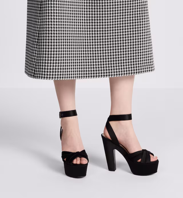 New for Winter 2023, the sophisticated Muse heeled sandal takes inspiration from the Haute Couture fashion show. Crafted in black satin, it is distinguished by a crossed effect on the front, while the ankle strap is adorned with a metallic CD buckle. Featuring a 13 cm (5) heel and 5 cm (2) platform, the shoe will elevate any evening wear.