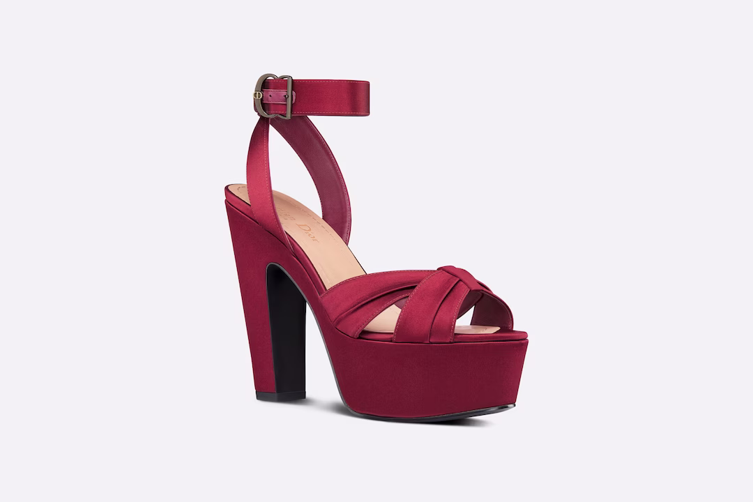 New for Winter 2023, the sophisticated Muse heeled sandal takes inspiration from the Haute Couture fashion show. Crafted in deep fuchsia satin, it is distinguished by a crossed effect on the front, while the ankle strap is adorned with a metallic CD buckle. Featuring a 13 cm (5) heel and 5 cm (2) platform, the shoe will elevate any evening wear.