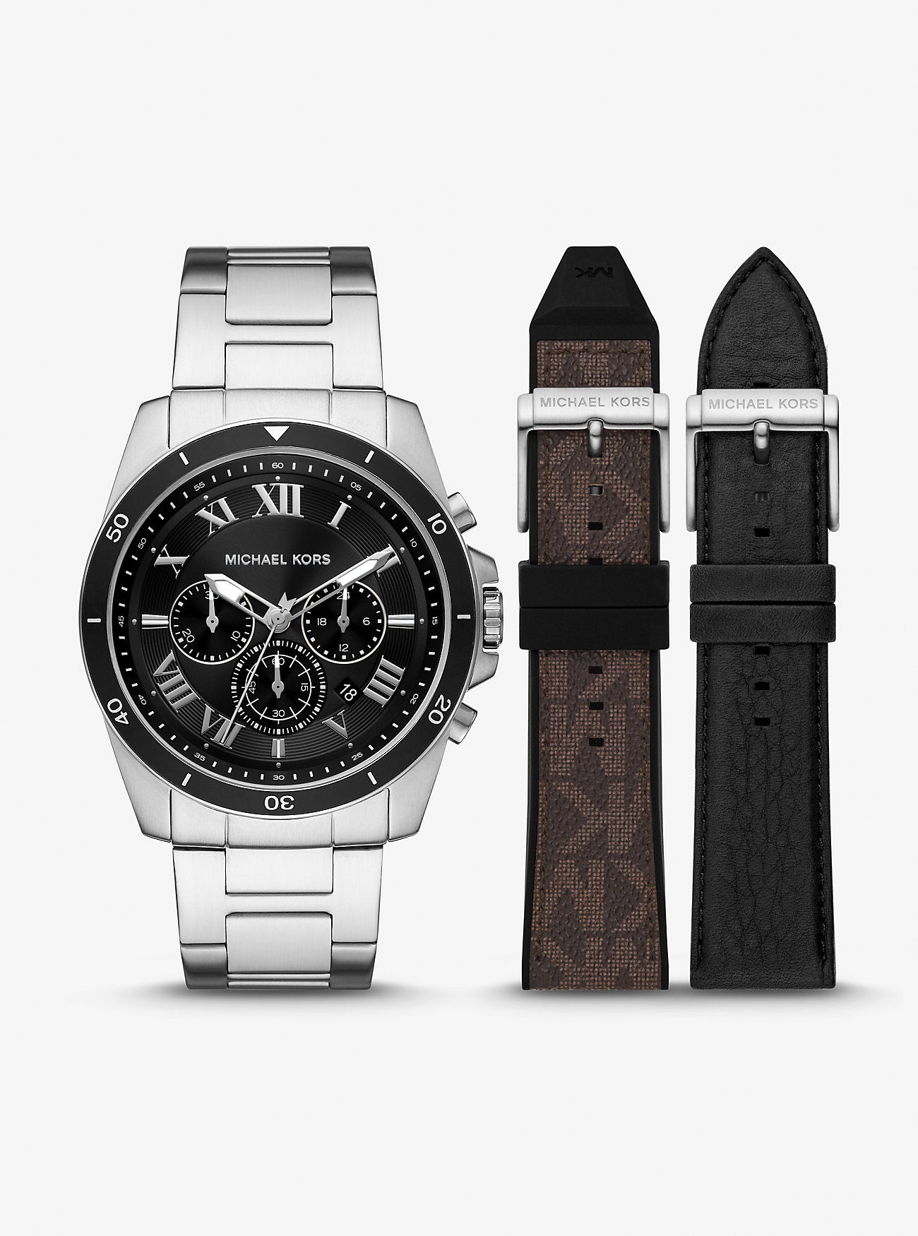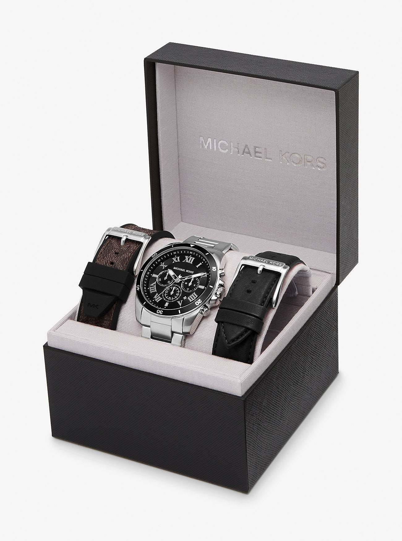 Give the gift of timeless style with our Alek 3-in-1 set. High on contrast and polish, this stainless-steel watch features a black dial with a chronograph display and date window for precise timekeeping. We love how the set includes both a logo-print canvas and leather strap that you can attach for added styling options. | ? Watch