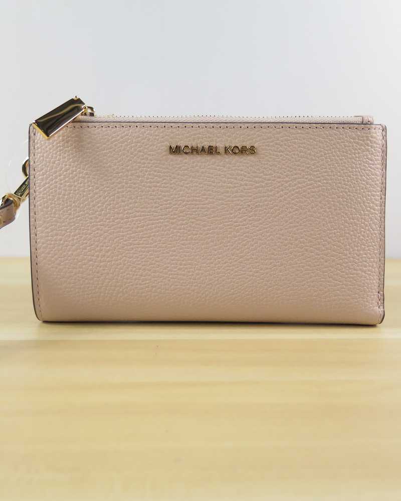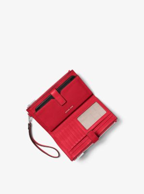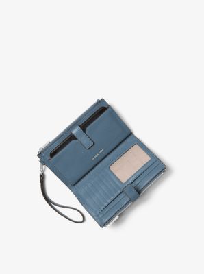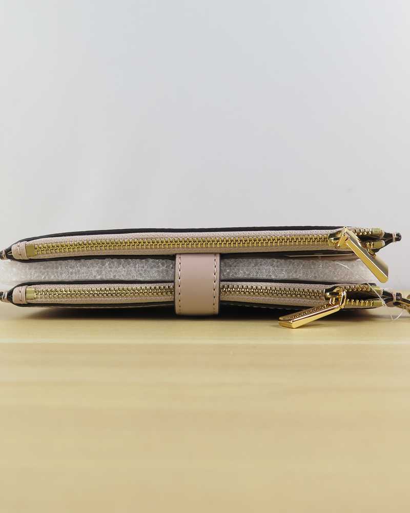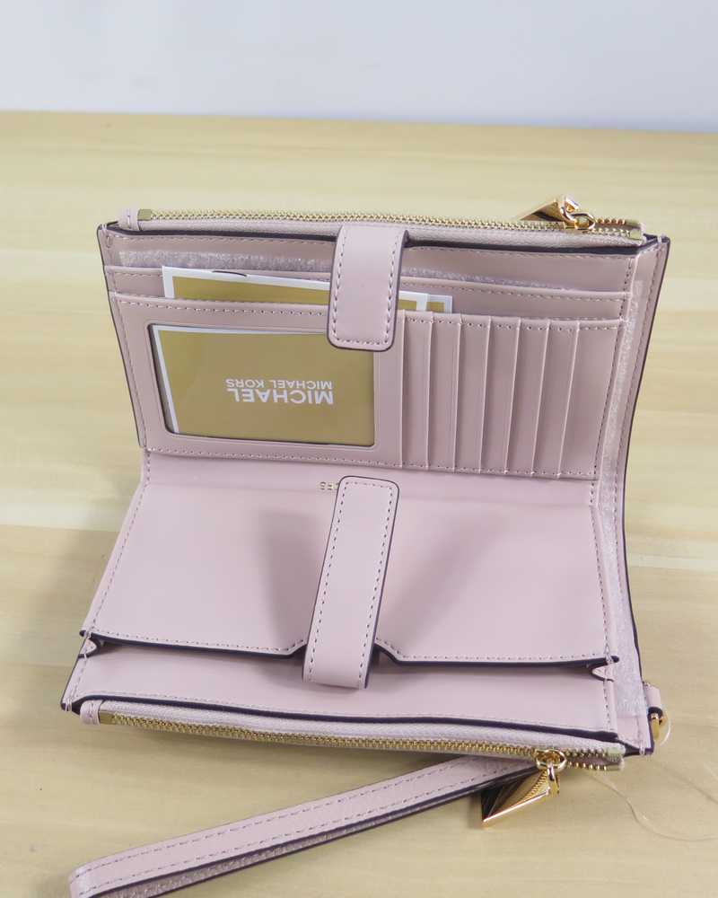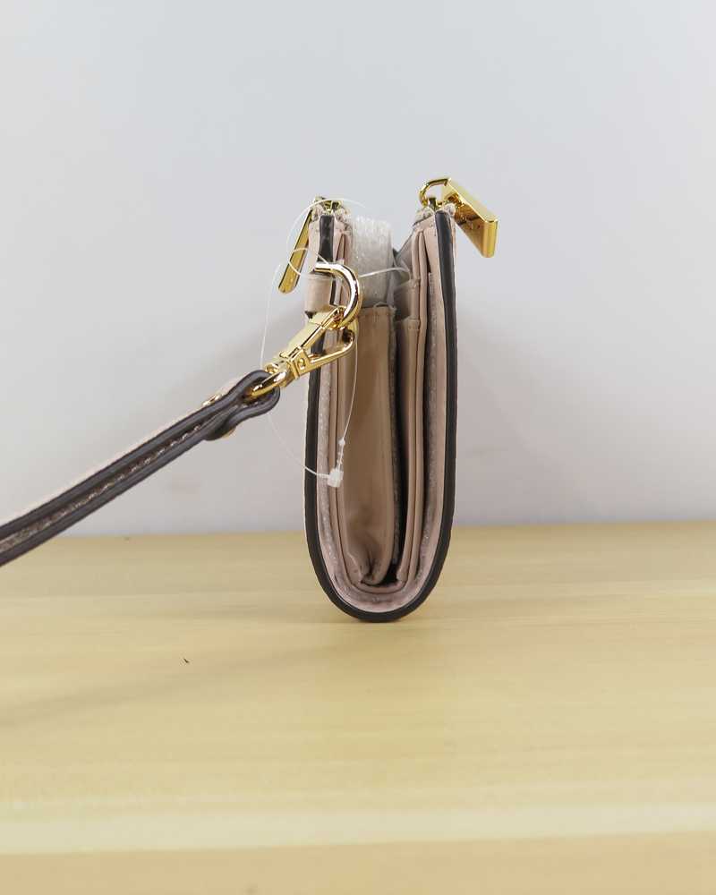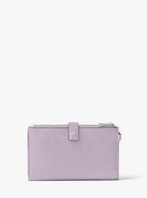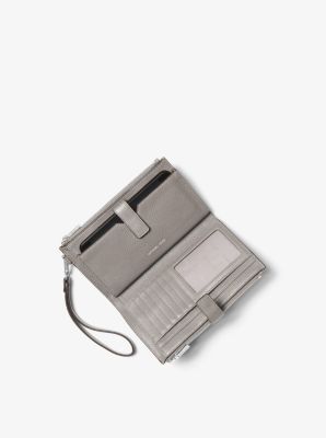 Done in a rich pebbled leather for timeless status this sleek wallet has two zip sides that unfold to reveal a center with pockets for all the essentials from credit cards to your smartphone. A wristlet strap perfects its versatility factor so it can be carried alone or in a tote.