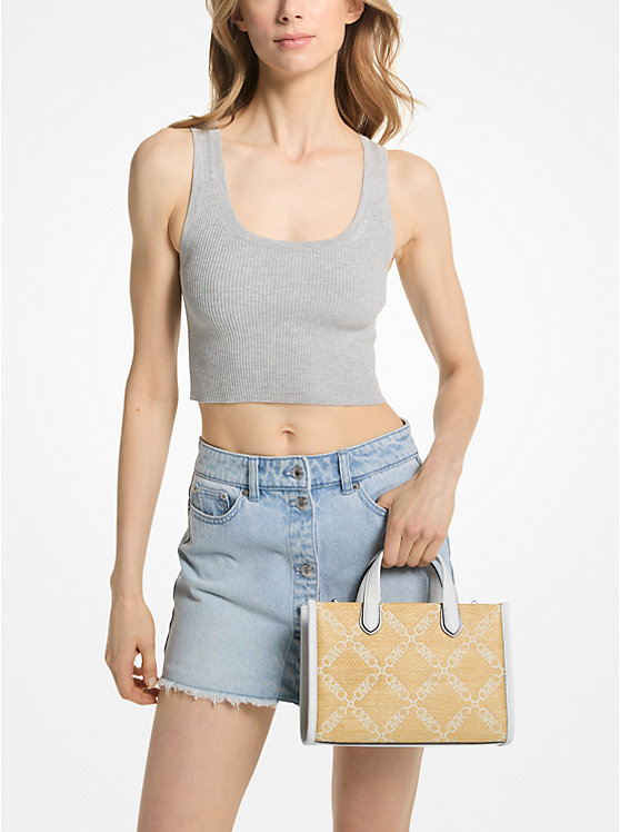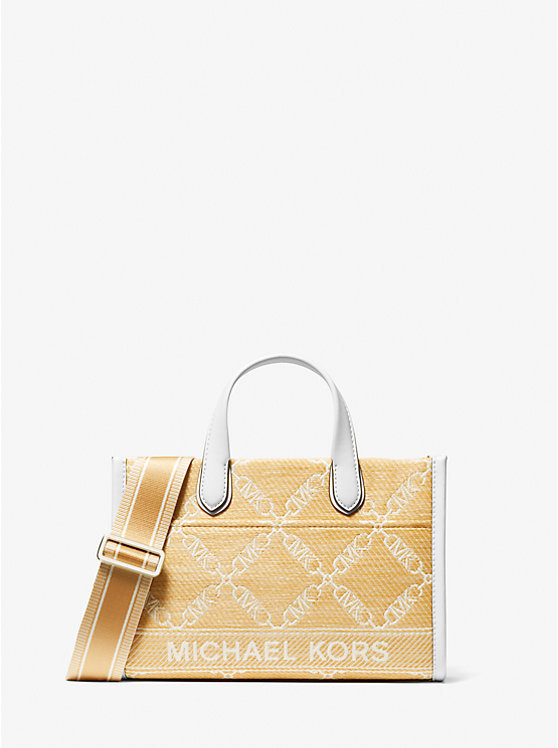Gigi Small Empire Logo Jacquard Straw Messenger Bag