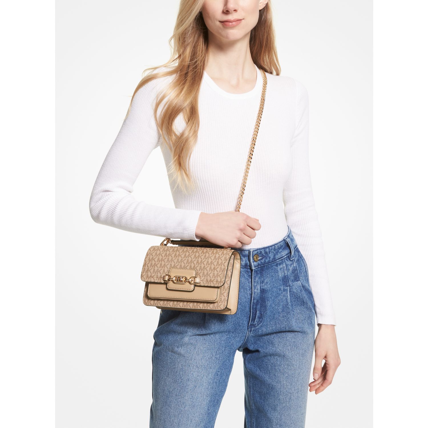 A smart and polished piece for every day, the Heather crossbody bag is crafted from Signature-print canvas in a modern fold-over silhouette with branded hardware for a novelty finish. It opens to a compact interior that’ll hold just the essentials—think your phone, card case and lipstick.