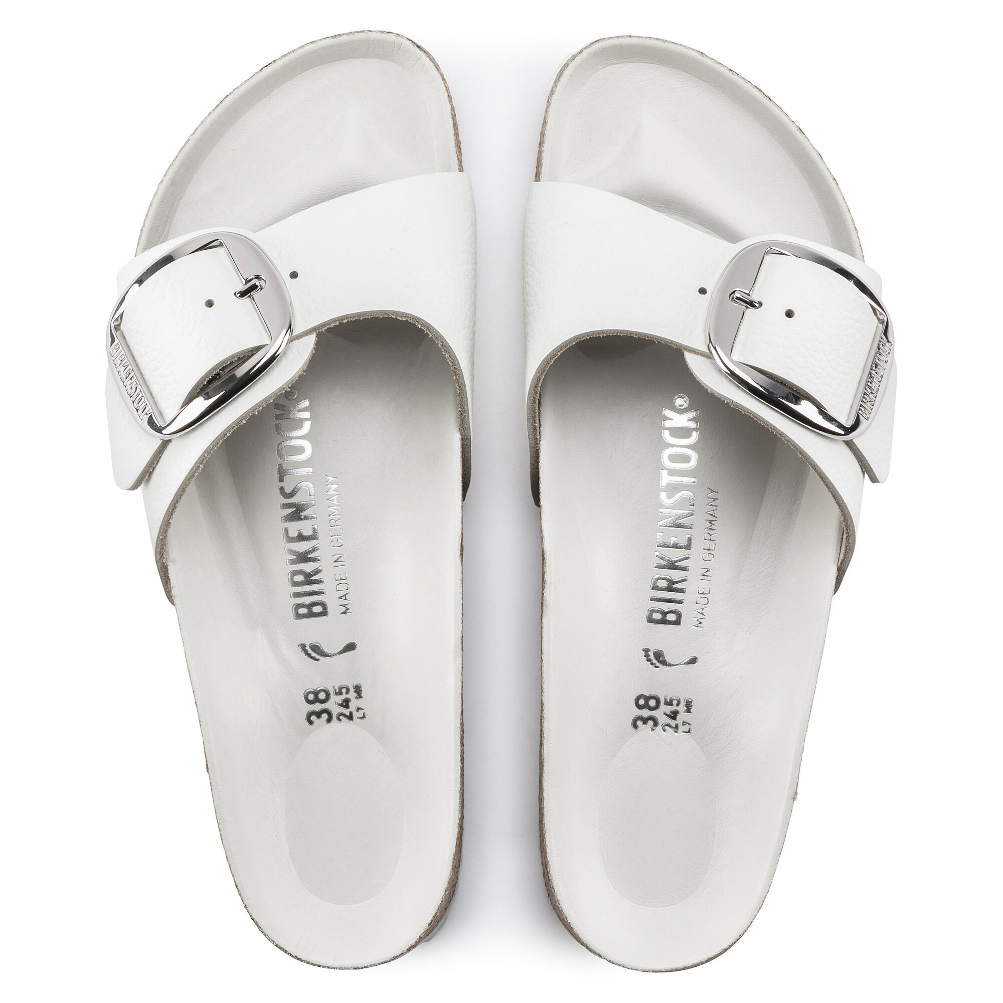 A strap, a buckle and a contoured cork footbed are masterfully combined to create the original Birkenstock sandal - the Madrid. An iconic slide with amplified buckle accent. The lining of the semi-exquisite footbed is covered with soft smooth leather and matches the upper in color. The upper is made from high-quality, especially soft natural leather.