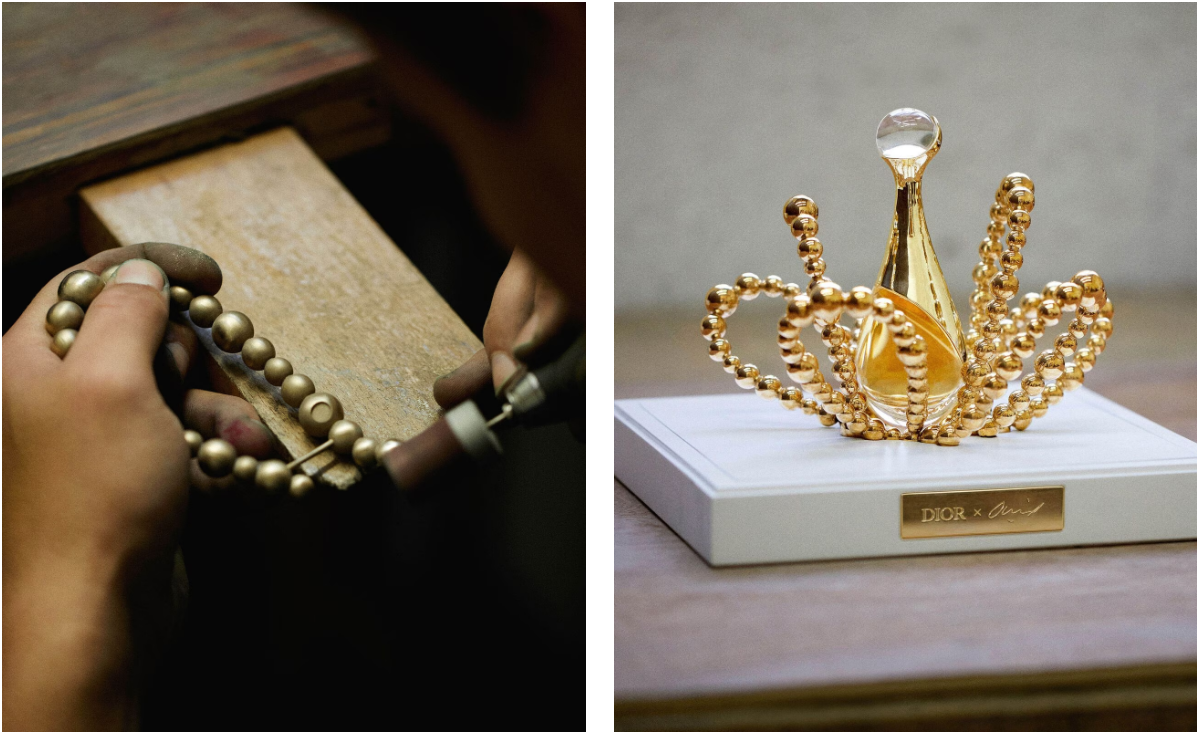 L'Or de J'adore (2023) by Jean-Michel Othoniel creates a new dialogue between the artist and the instantly iconic women's perfume. Jean-Michel Othoniel imagined a flower-like case to house the trail of J'a l'Or, Francis Kurkdjian's first composition for the House.