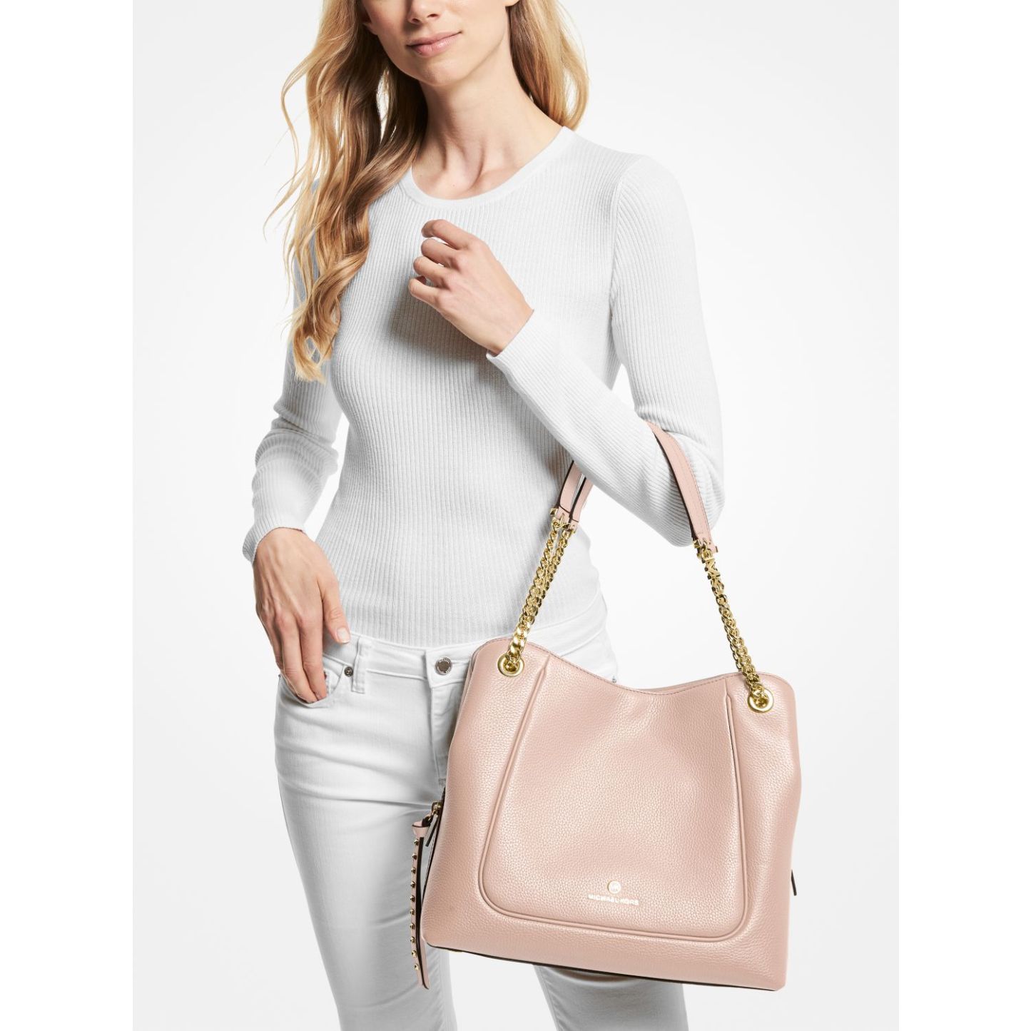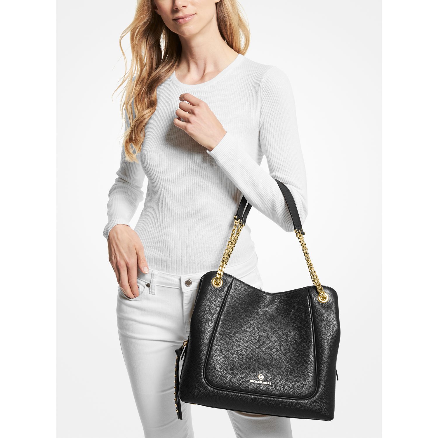 Our Piper is an essential carryall for this season and the next. Strung from a gold-tone chain-link strap, this spacious style is crafted from pebbled leather that opens to reveal a median zip compartment for on-the-go organization. We love how the shoulder bag gently folds at the sides to comfortably nestle under your arm.