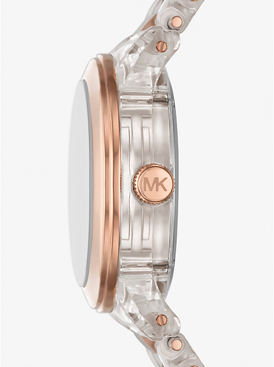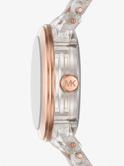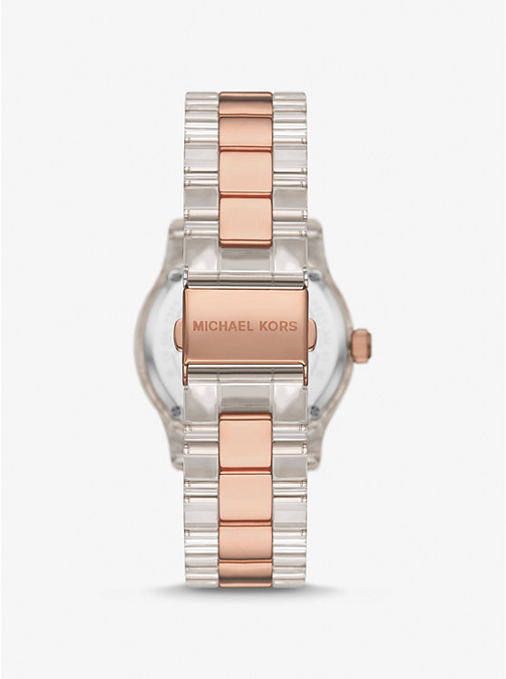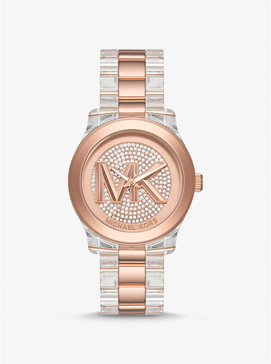 A small timepiece that makes a big impact, our beloved Runway watch gets a modern update. Crafted from a mix of rose gold-tone stainless steel and acetate, this eye-catching style features a high-shine pavé dial finished with our MK initials Stack it with complementing jewelry for a layered, cool-girl look.