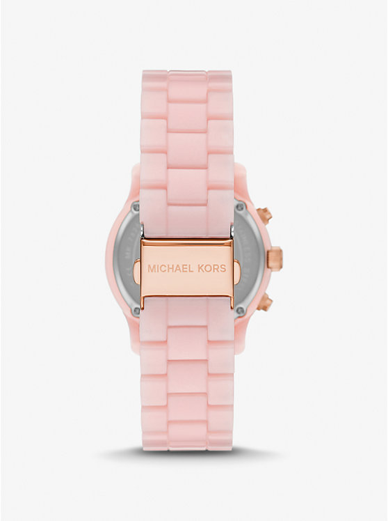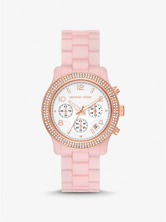 The perfect finishing touch to every outfit, our new Runway watch will be a favorite for years to come. Updated with raised sub dials, this dazzling style is crafted from rose-gold stainless steel and blush-hued acetate with a pavé-embellished bezel, and features chronograph details for precise timekeeping.