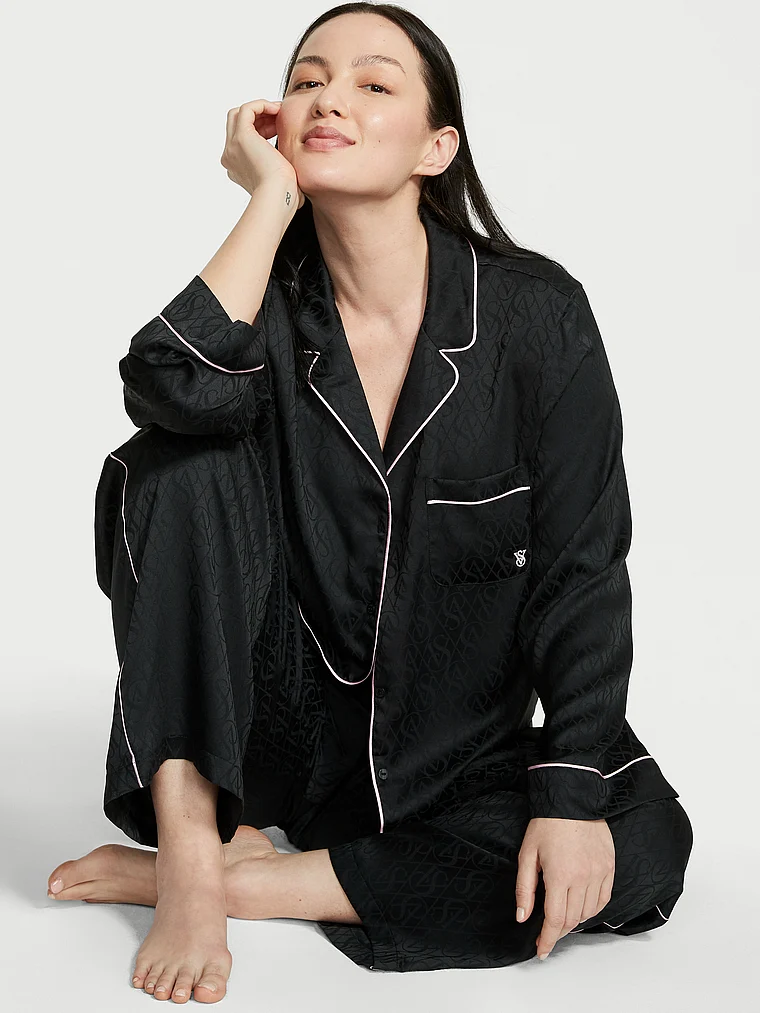Now entering sleep mode. Relax in this satin pant and matching long-sleeve top with a chest pocket, notch collar, and decorative piping.