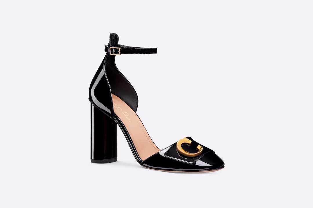 New for Winter 2023, the C'est pump is an elegant and modern creation. Crafted in black patent calfskin, the streamlined style is enhanced by gold-finish metal C and D letters, inspired by House archives. Completed by a rounded toe with a modern look and a 10 cm (4) cylindrical heel, the ankle-strap pump will lend a refined touch to any outfit.