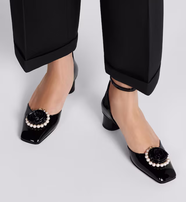 New for Winter 2023, the Rose pump is a modern, elegant creation that honors Catherine . The black patent calfskin upper is embellished with a rose inspired by the Roger Vivier for archives, delicately encircled by white and gold-tone resin pearls and the CD signature. The strap delicately highlights the ankle and the 3.5 cm (1.5) cylindrical heel complete the jeweled shoe.