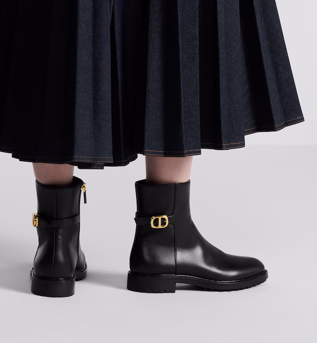 New for Winter 2023, the 30 Montaigne ankle boot is both a modern and timeless creation. The black calfskin combines with the notched rubber sole, making it effortless and comfortable. The ankle strap is enhanced by a gold-finish CD clasp, giving it the hallmark touch. The ankle boot is an ideal accessory for any casual attire.