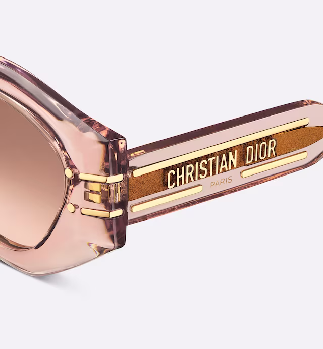 The Signature B1U sunglasses from the House's iconic line are a modern and bold butterfly-shaped design. The transparent pink acetate frame is distinguished by a play of curves and volumes for a graphic touch while the temples reveal the Paris signature, further embellished with gold-finish metal lines that extend onto the front. Completed by gradient brown-to-pink lenses, the new essential will lend a decisively style to any look.